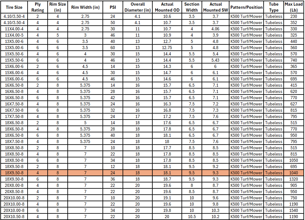 The Kenda K500 Super Turf is the premier tire for turf applications and is the OEM choice for many ZTR and high-end commercial mower manufacturers. For commercial or heavy residential use, the Kenda K500 will provide "everything you want and more" in a lawn and garden tire.