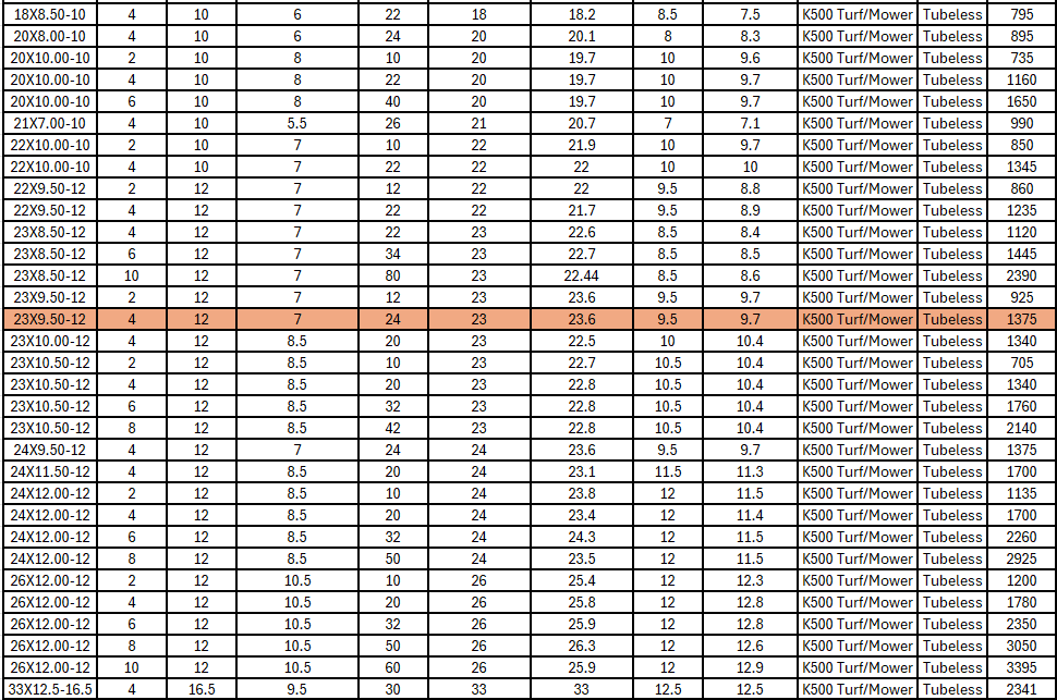 The Kenda K500 Super Turf is the premier tire for turf applications and is the OEM choice for many ZTR and high-end commercial mower manufacturers. For commercial or heavy residential use, the Kenda K500 will provide "everything you want and more" in a lawn and garden tire.