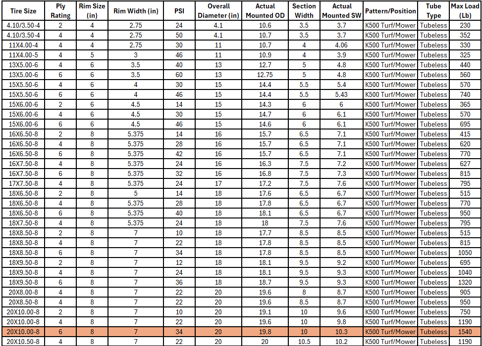 The Kenda K500 Super Turf is the premier tire for turf applications and is the OEM choice for many ZTR and high-end commercial mower manufacturers. For commercial or heavy residential use, the Kenda K500 will provide "everything you want and more" in a lawn and garden tire.