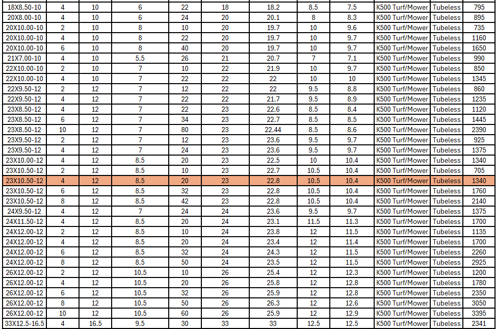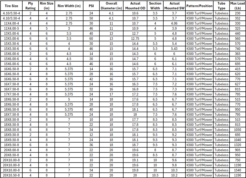 The Kenda K500 Super Turf is the premier tire for turf applications and is the OEM choice for many ZTR and high-end commercial mower manufacturers. For commercial or heavy residential use, the Kenda K500 will provide "everything you want and more" in a lawn and garden tire.